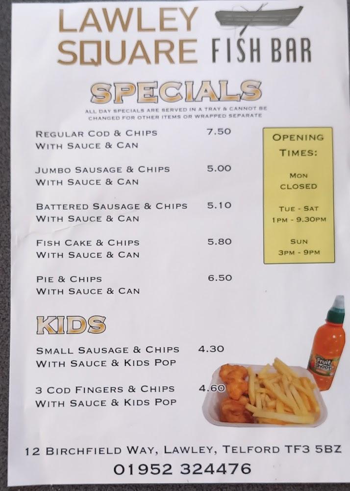 Located at 5 Birchfield Way in Overdale, Telford, Lawley Square Fish Bar stands out as a beloved local eatery. The atmosphere strikes a balance between casual and welcoming, making it a perfect spot for a family meal or a quick bite. With flexible hours, open every day of the week, it caters to both lunchtime cravings and evening snacks. Those in the know appreciate its solid reputation for serving high-quality fish and chips; this is no ordinary takeaway. Customers regularly rave about fresh, made-to-order fish, cooked to perfection, alongside classic sides like crispy chips and mushy peas. In addition to fish and chips, the menu includes several options like kebabs and various sauces, which cater to a wider range of tastes. It’s an establishment that feels like home, contributing to the warm community vibe in Telford.